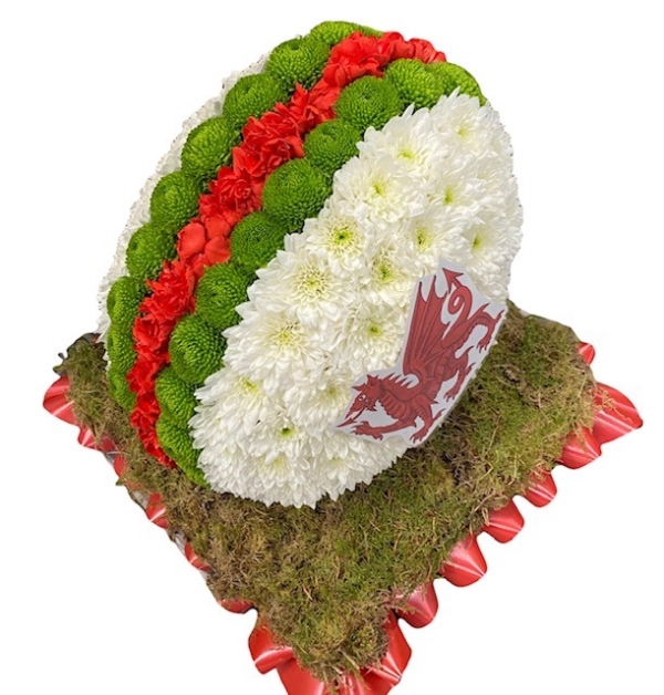 3D Rugby Ball Funeral Tribute, made using a pre-cut floral foam frame 30cm x 30cm x 30cm, double headed Chrysanthemums are used to create this design, with Kermit chrysanthemums and red spray carnations, moss base finished in a red ribbon trim.