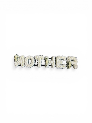 Mother Funeral Tribute is made on a pre-made floral foam frame, It is made using white Double headed Chrysanthemum as the base, cream rose flower placements and is finished with sage green ribbon edging.