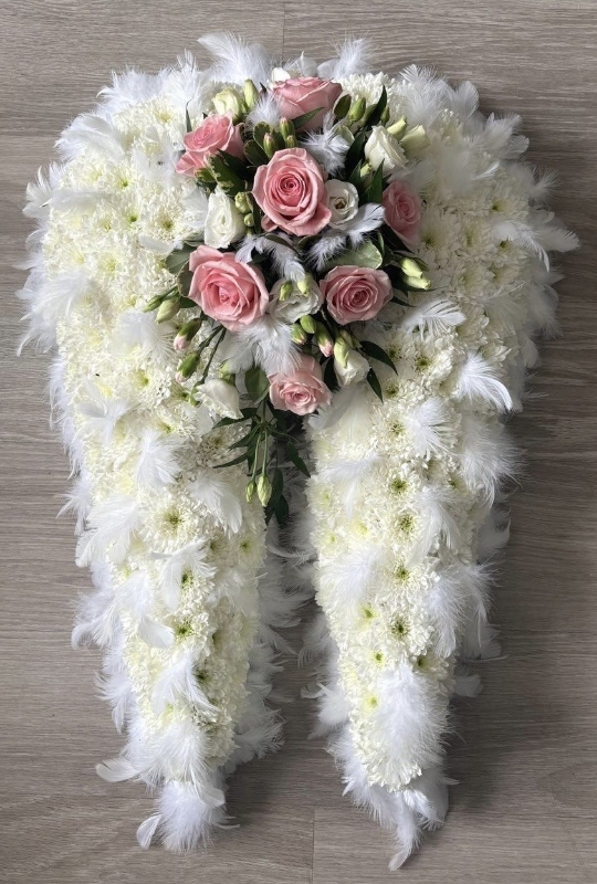 Angel Wings Funeral Flower Tribute is made on a pre - cut floral foam frame, there are two sizes to choose from. Made using white double headed Chrysanthemum for the base, finished with a white feathers plus a delicate placement consisting of pink Roses, Lizzie plus foliage.