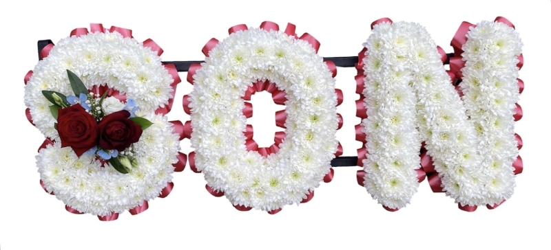 Son Funeral Tribute is made on a pre-made floral foam frame, It is made using white Double headed Chrysanthemum as the base, the placements are red roses with seasonal flowers, finished with red ribbon edging.