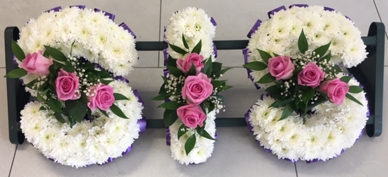 Sis Funeral Tribute is made on a pre-made floral foam frame, It is made using white Double headed Chrysanthemum as the base, with yellow rose flower placement and is finished with purple ribbon edging.