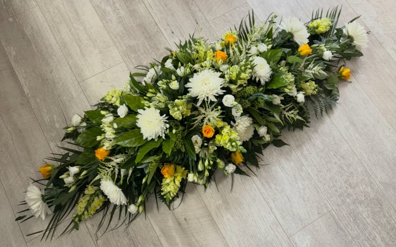 Beautiful yellow and white coffin spray made using floral foam, using roses, blooms, lizzie, other seasonal flowers and foliage to finish.